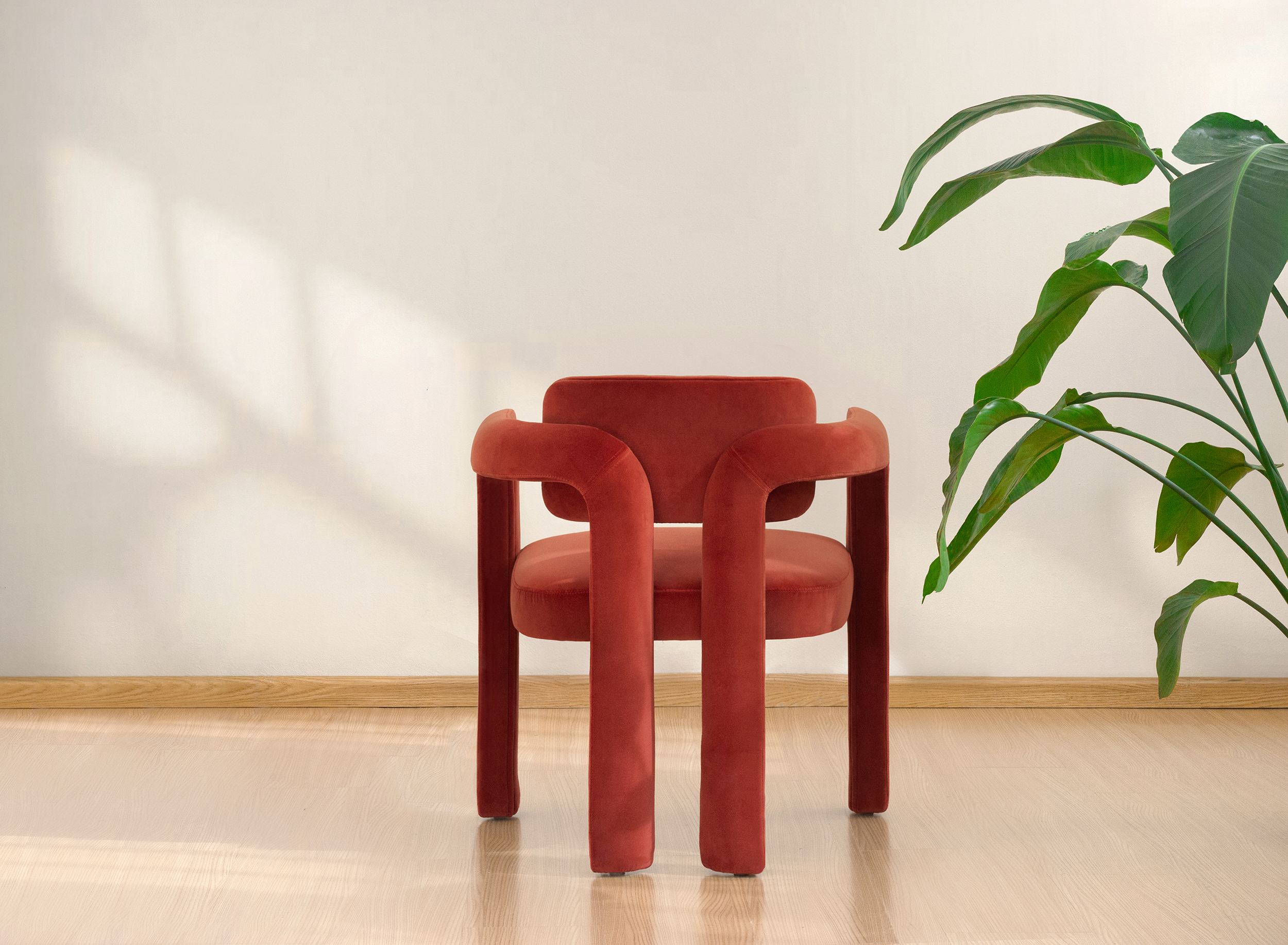 Inspired by this rock formation with intertwined sandstone arches, the design of the Double Arch dining chair conveys the same flat shape underneath the natural arches, showing a unique cut beneath the curvy arms that purposefully disrupts the chair’s organic aesthetic.